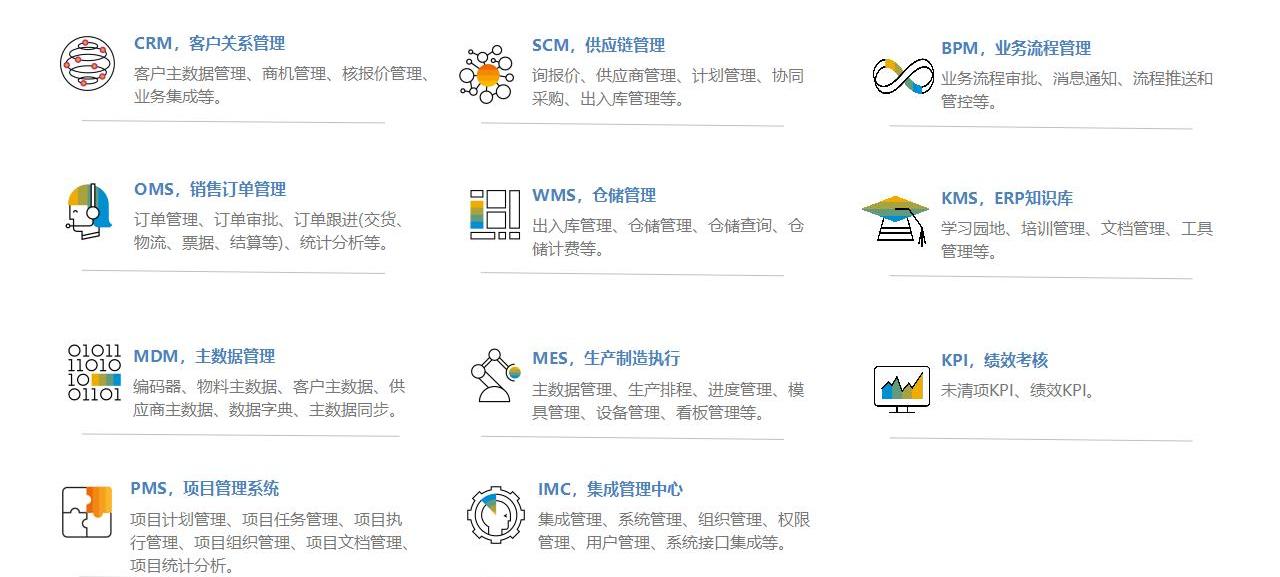 依據(jù)需要可選配需求功能,即插即用,包括模塊:CRM、SCM、WMS、MES、OMS等。