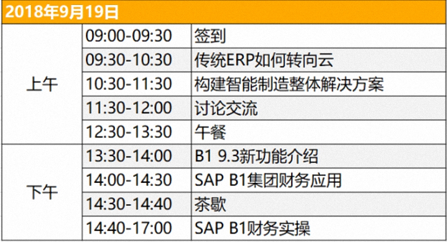 9月19日,工博科技將攜手SAP資深顧問(wèn),為尋找信息化升級(jí)的新老客戶,帶來(lái)一場(chǎng)關(guān)于SAP Business One的技術(shù)交流盛宴。同時(shí)也將現(xiàn)場(chǎng)分享,傳統(tǒng)的本地部署ERP如何轉(zhuǎn)向云,SAP B1如何進(jìn)行智能生產(chǎn)管控。