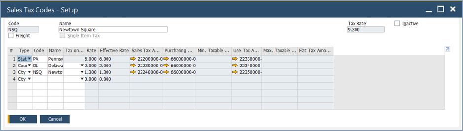 稅收管轄權(quán)可以是城市、縣、州,也可以是用戶定義的任何附加值。通常,美國稅收由貨物或服務(wù)的提供地點(diǎn)確定;因此,SAP Business One 根據(jù)分配給客戶的收貨方地址的稅碼確定銷售單據(jù)的相應(yīng)稅碼。在采購方,根據(jù)所選倉庫確定稅碼。