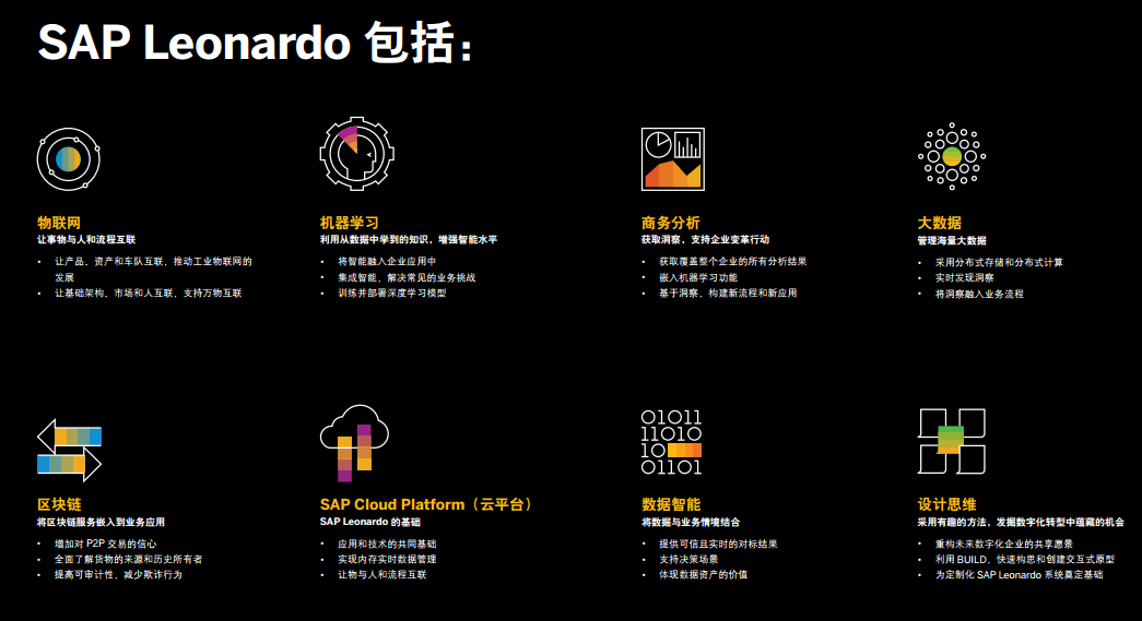 SAP Leonardo提供全新的機器學習、物聯(lián)網(wǎng)、大數(shù)據(jù)和商務分析等能力。企業(yè)能夠重新構(gòu)想和定義流程,轉(zhuǎn)型成為真正的數(shù)字化企業(yè)。